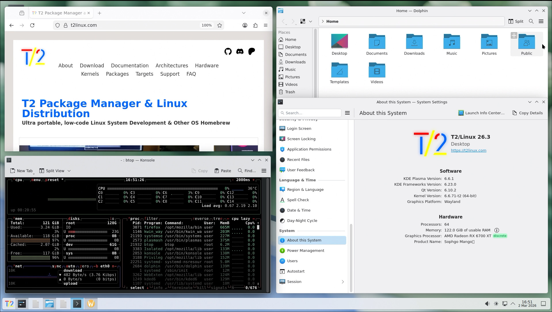 The result is a reproducible, modern Linux system spanning mainstream and RISC architectures alike. Combining a cutting-edge KDE Wayland desktop with T2's long-standing cross-platform support.